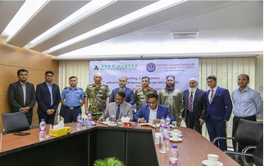 Sena Kalyan Insurance Company Ltd. (SKICL), a concern of Sena Kalyan Sangstha, decided to raise fund through IPO under Fixed-Price Method. An agreement was signed between Sena Kalyan Insurance Company Ltd. and AAA Finance & Investment Ltd. (AAA) on 24th October, 2019 in order to appoint AAA as Issue Manager. On this auspicious occasion Maj Gen Firoz Hasan, ndu, psc, Chairman, Brig Gen Shafique Shamim, psc (Retd), Chief Executive Officer of Sena Kalyan Insurance Company Ltd. and Mr. Khwaja Arif Ahmed, Chairman, Mr. Mohd. Obaydur Rahman, FCS, MD & CEO of AAA were present. Other top management personnel of both the companies were also present on the occasion.